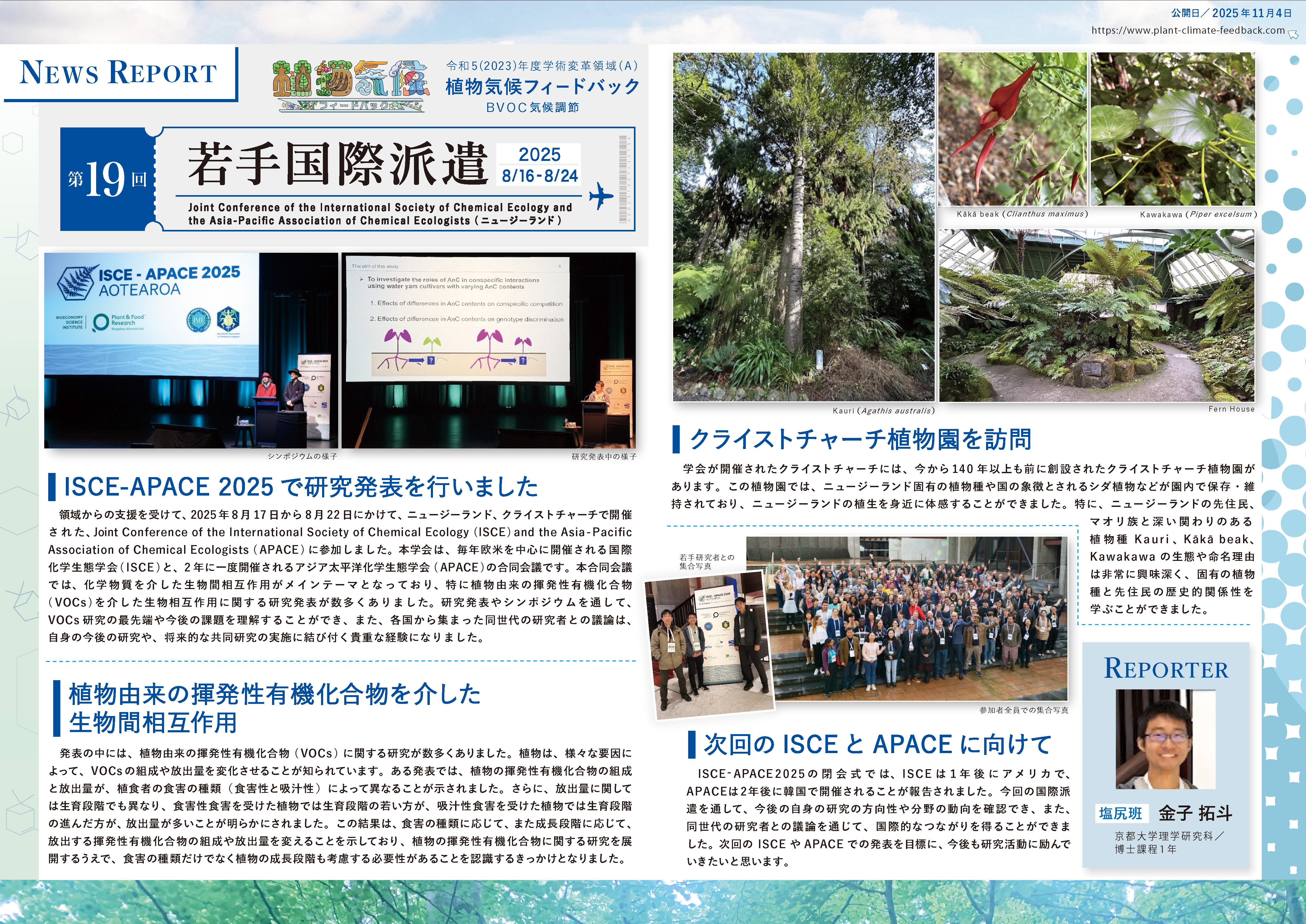 領域から支援をいただき、2025年8月16日から8月24日にかけて、ニュージーランドで開催されたJoint Conference of the International Society of Chemical Ecology (ISCE) and the Asia-Pacific Association of Chemical Ecologists (APACE)参加しました。