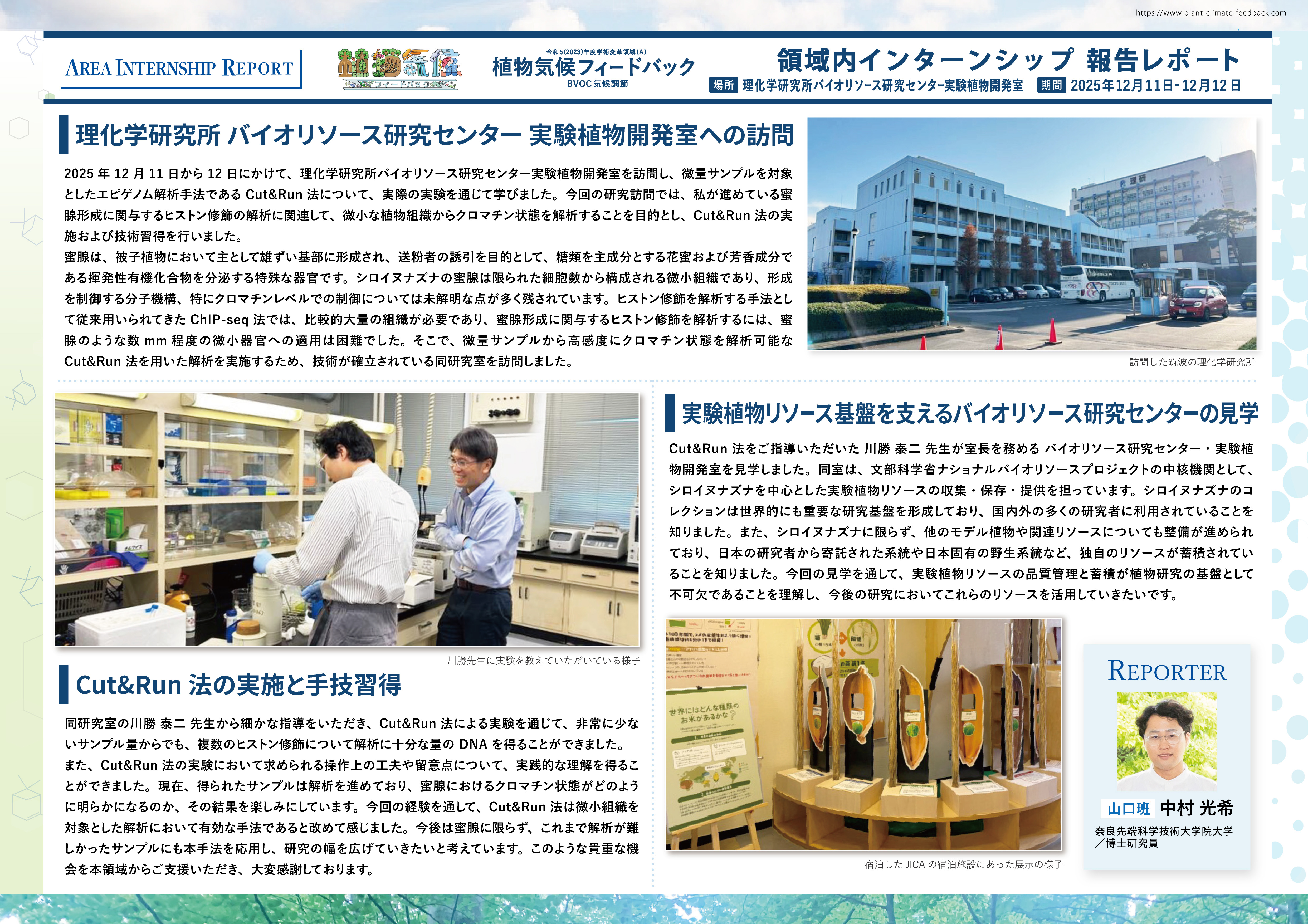 領域内インターンシップ 2025年12月11日〜12日にかけて、山口班中村が理化学研究所 バイオリソース研究センター 実験植物開発室を訪問しました。