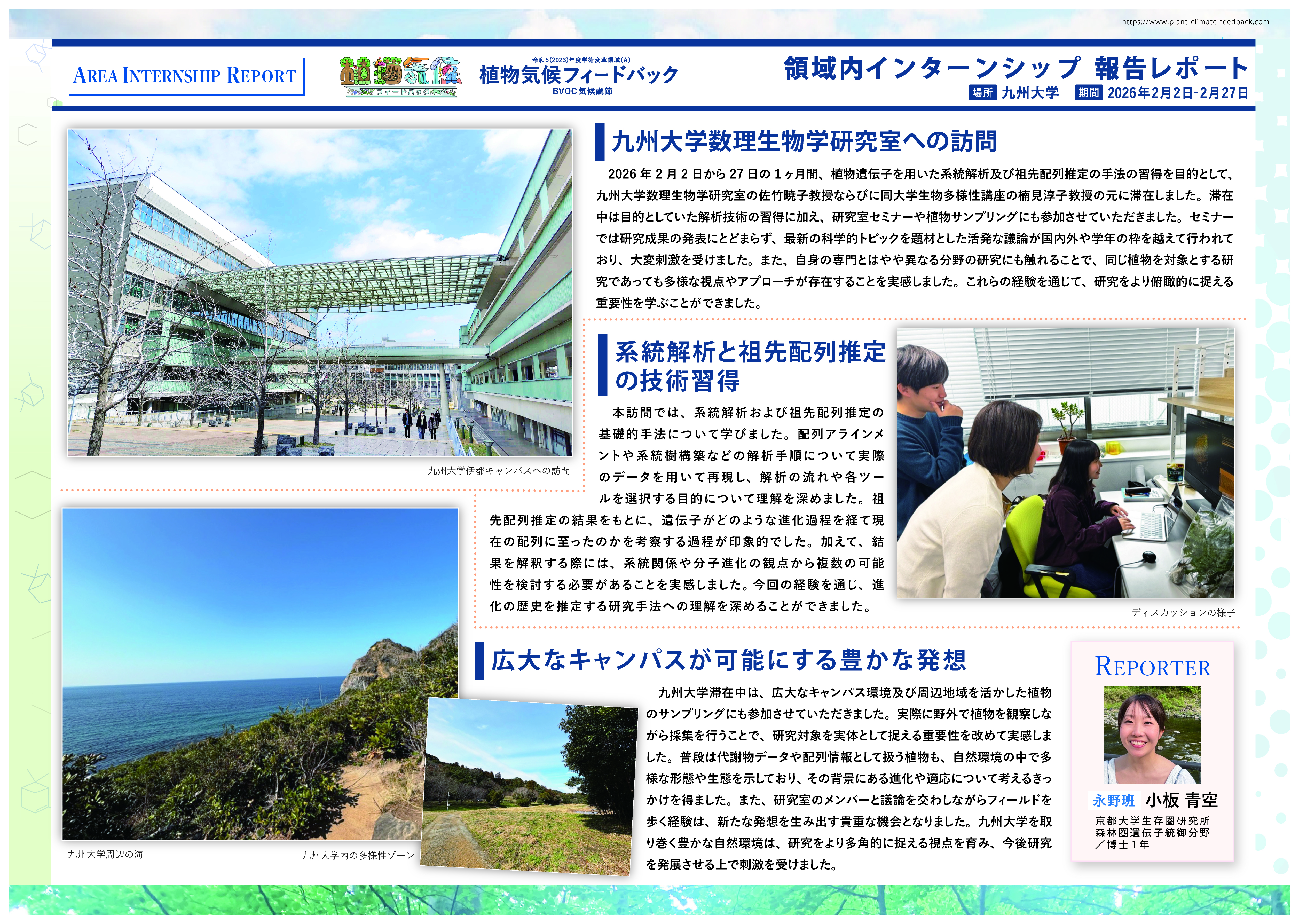 2026年2月2日〜27日にかけて、永野班棟方の研究室の大学院生小板が九州大学 佐竹暁子教授の数理生物学研究室に滞在し、実験技術の習得や研究セミナーに参加しました。